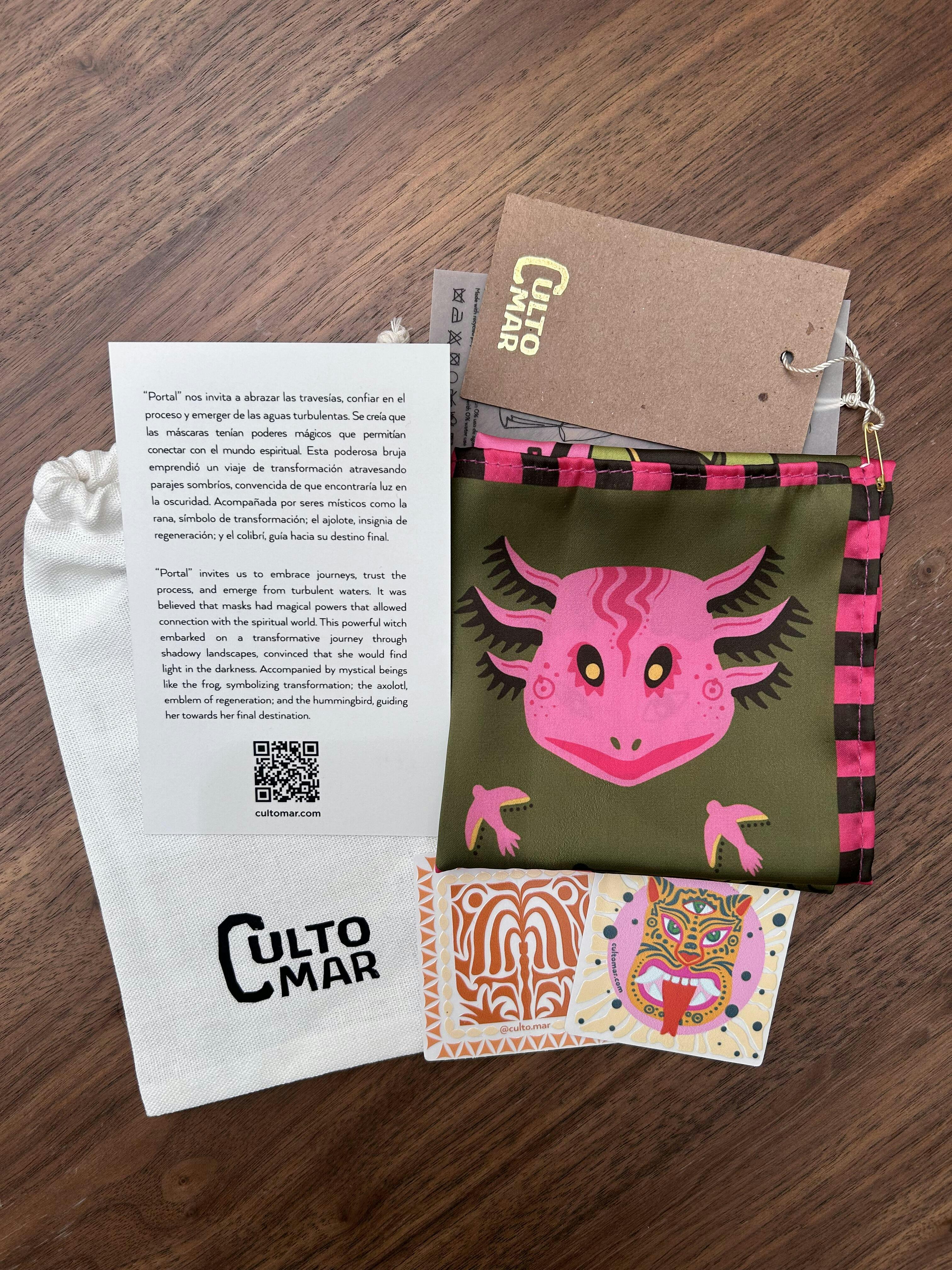 El pañuelo Portal hace referencia a una poderosa bruja que nos invita a abrazar las travesías, confiar en el proceso y emerger de las aguas turbulentas. Acompañada por seres místicos como la rana, símbolo de transformación; el ajolote, insignia de regeneración; y el colibrí, guía hacia su destino final.